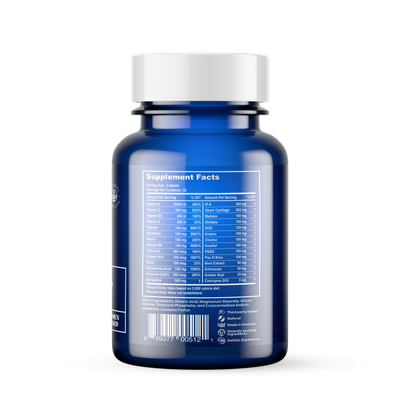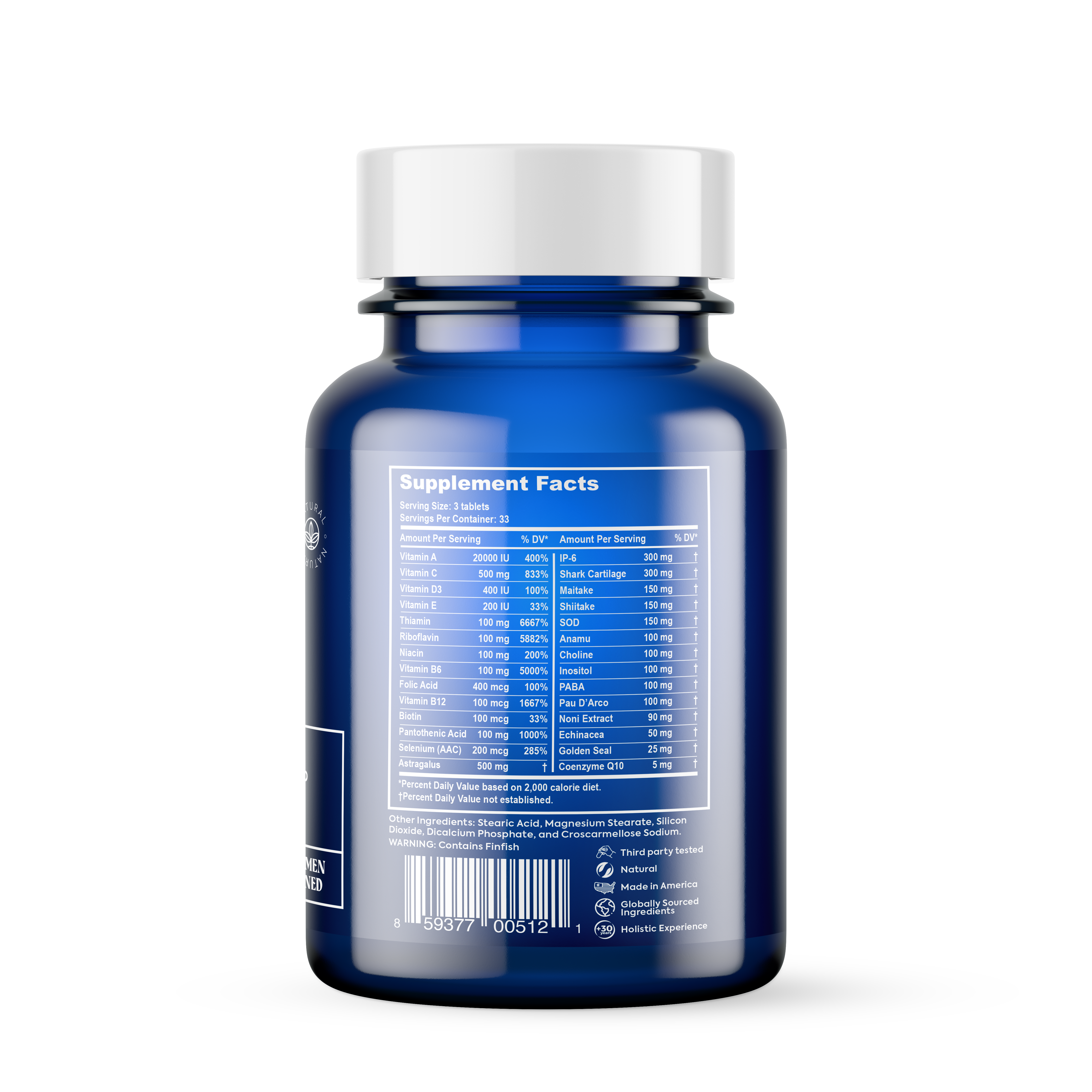 Vitamin A · Vitamin C · Vitamin D3 · Vitamin E · Thiamin · Riboflavin · Niacin · Vitamin B6 · Folic acid · Vitamin B12 · Biotin · Pantothenic acid · Selenium · Astragalus · Ip-6 · Shark cartilage · Maitake · Shiitake · Sod · Anamu · Choline · Inositol · Paba · Pau d'arco · Noni extract · Echinacea · Goldenseal · Coenzyme q10 · Other ingredients: stearic, acid, magnesium stearate, silicon dioxide, dicalcium phosphate, and croscarmellose sodium