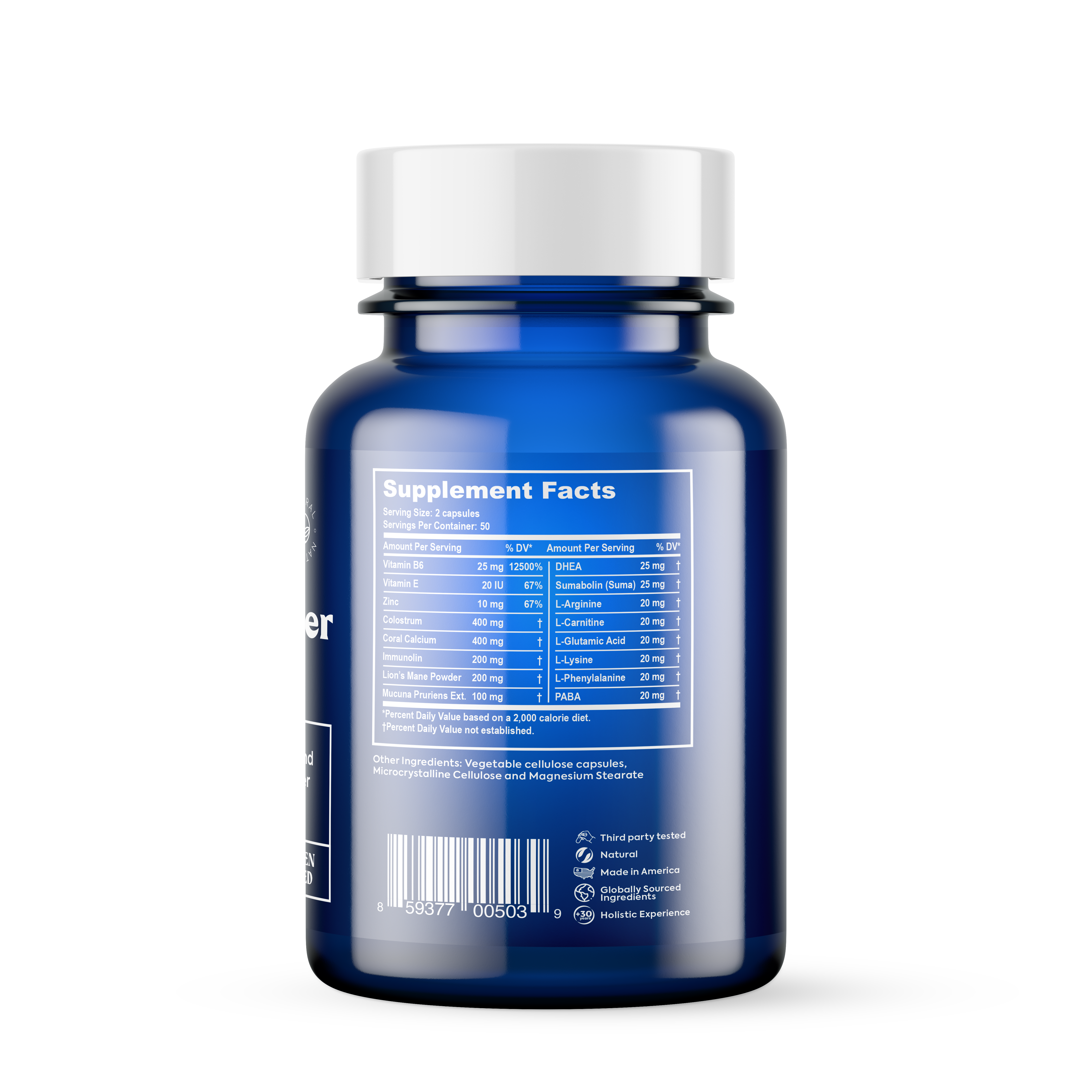 · Coral Calcium · Colostrum · Mucuna Pruriens Ext · Immnolin HD · Sumabolin · Amino Acid Blend · DHEA · Vitamin B6 · Vitamin E · PABA · Zinc